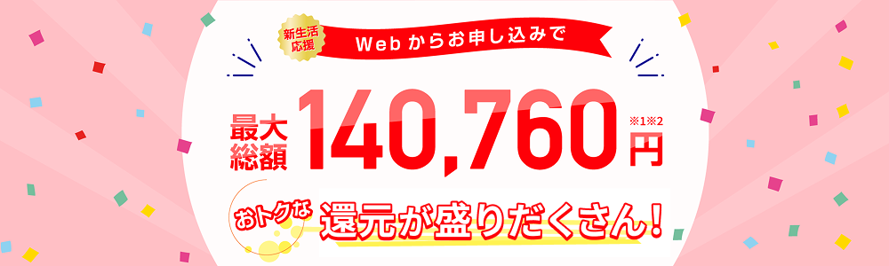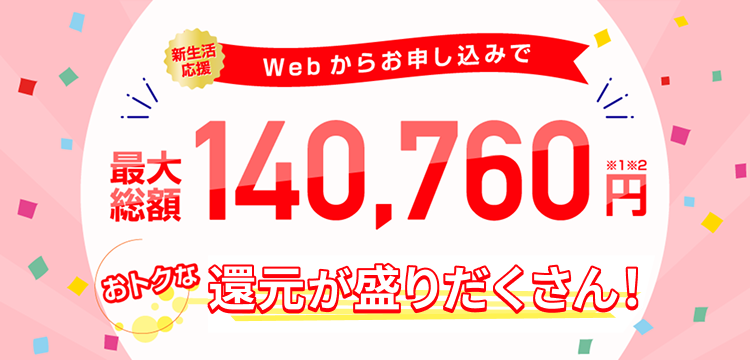 ※1 表記の特典は、コミュファ光1年間980円キャンペーン:1年間割引総額50,280円(月額税込4,190円割引×12カ月)、WEB限定キャッシュバックキャンペーン3:最大10,000円還元、当サイト限定キャッシュバックキャンペーン:5,000円還元、オプションスタートキャンペーン:最大18,500円分還元【特典A 10ギガメニュー(スタート割)+Netflixパックプレミアムプランオプション:11,000円分・特典B ファストコネクトオプション(ゲーミングカスタム):3,500円分・特典C コミュファ光メッシュWi-Fi:4,000円分】、光電話特別割引キャンペーン:1年間割引総額2,640円(月額税込220円x12カ月)、初期費用・工事費、等割引:最大54,340円を合計した特典総額となります。