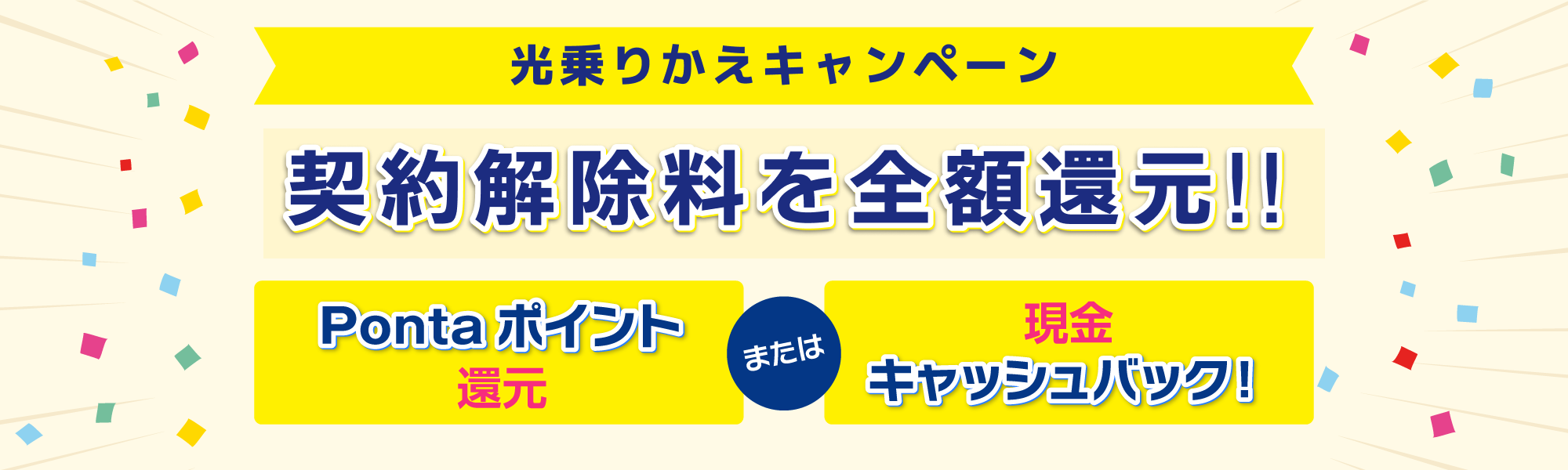 | 注意事項 | 【還元方法・還元時期】 ・Pontaポイント 又は 現金キャッシュバック(光乗りかえキャンペーンの還元方法がその他キャンペーンにも適用されます。) ※振込用紙によるお振込み等、その他還元方法による還元は実施できません。 ・回線工事完了後、他社契約解除料明細書貼付台紙をコミュファが受領した月、またはコミュファアプリにて「他社契約解除料なし申請」を受け付けた月を1カ月目として6カ月目の末日までに実施いたします(回線工事完了時点で他社契約解除料明細書貼付台紙を送付済みの場合は、回線工事完了月を1カ月目とします)。 【他社契約解除料補填について】 ・月額料金や一部端末機器の割賦代金、モバイル回線にかかる契約解除料等、他社固定回線の解約に伴う一時金以外のコミュファが認めない金額は対象外となります。 ・他社契約解除料が発生しない場合、他社契約解除料明細書(コピー)貼付台紙の送付または、コミュファアプリから「他社契約解除料なし申請」を実施いただく必要がございます。なお、コミュファアプリからキャンペーン特典受取申請を実施いただく場合、他社契約解除料明細書(コピー)貼付台紙の送付は不要です。他社契約解除料明細書(コピー)貼付台紙の送付とコミュファアプリから「他社契約解除料なし申請」の両方を実施いただいても特典は重複して還元されません。 ・他社契約解除料の全額還元には、他社契約解除料明細書(他社契約解除料の内訳が分かる書面)が必要です。他社解約後、経過期間によっては、明細書入手が困難な場合があります。 ・事業者によってはお問い合わせをしない限り、明細書の送付がない場合もありますので、必ず解約時に該当事業者様までお問い合わせください。 ・他社契約解除料明細書(他社契約解除料の内訳が分かる書面)の送付がない場合は還元いたしません。「他社利用期間」ならびに「他社契約解除料支払い」が分かる書面の同封がある場合に限り、上限を10,000円としてコミュファにて還元額を判断いたします。 ・他社契約解除料明細書の送付については、一度にまとめて送付いただく必要があります。追加で明細書を送付いただいた場合でも、二度目以降の明細書は対応不可とし、還元額は一度目に送付いただいた明細書を基準にコミュファにて判断いたします。 ・ご利用のインターネット回線の提供事業者と、電話やテレビ、ISPの提供事業者が異なる場合に、それぞれの事業者の明細書をまとめて送付いただく必要があります。同一事業者でのご利用の場合でも明細書が確認できる時期が異なる場合があります。 ・他社契約解除料が発生しない場合はコミュファアプリからでも「他社契約解除料なし申請」を実施いただけます。 【キャッシュバックについて】 ・キャッシュバックのお手続き方法につきましては、別途弊社よりご案内する手続きを実施いただいた後、指定口座へお振り込みとなります。なお、振込業務は、株式会社DGフィナンシャルテクノロジーに委託しており、対象のお客さまには「CASH POST」サービスをご利用いただきます。 ・「CASH POST」サービスの受取にはお手続きの期限があります。「キャンペーン特典受取メール」の送信日より45日以内にお手続きが必要です。期限を超過した場合は権利喪失となります。 【Pontaポイント還元について】 ・加算されるポイントは「Pontaポイント」となります。ポイントの加算には、au IDが必要です。 ・別途弊社よりご案内する手続きを実施いただいた後、「au ID」に対してポイントを加算いたします。 ・au IDの連携は、Myコミュファからお手続きいただけます。 au IDの連携は、コミュファ光の開通後にお手続きいただけます。 ・特典還元時点でau IDの連携をいただけていない場合は権利喪失となります。 【セットアップ無料について】 ・別途、コミュファ開通センター (0120-538-390/9:00~21:00 年末年始除く)へのお申し込みが必要です。 ・セットアップの対象範囲は弊社が別に定める規定に基づき、対象とする機器のインターネット接続設定・無線接続設定・メール・セキュリティ対策ソフト(ウイルスバスター クラウド 月額版)となります。セットアップを実施する機器の台数は4台までとさせていただきます。 【その他】 ・キャンセルの場合や、コミュファ光の都合により回線工事ができない場合、お申し込み内容に記入漏れ・不備等がある場合、過去3カ月以内にコミュファ光を解約された方が同一設置場所で新規申込を した場合は、適用外となる場合があります。 ・「コミュファ光1年間980円キャンペーン」「50,000円還元キャンペーン」「WEB限定キャッシュバックキャンペーン3」とは併用できません。 ・以下の場合、特典還元対象外となりますのでご注意ください。 ※特典還元時点で対象メニューの契約を継続いただけていない場合 ※その他特典還元対象外の条件(回線契約キャンセルをした場合/コミュファ光の都合により回線工事ができない場合/お申し込み内容に