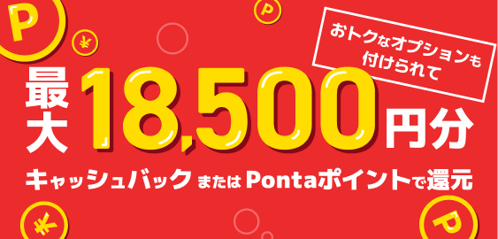 適用条件/還元条件を満たしたお客さまへ最大18,500円分(特典A~C合算)をキャッシュバック又はPontaポイントで還元いたします。